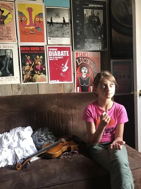 Sadie: Yes, playing in orchestra helps. Because in both of them, you have to be part of a team! You have to be aware of what the other musicians around you are doing. You have to block everything and everyone else out and focus on your own part. And you want to make sure that you do your best and not let the other players down. Also, if you’re in a big space like McCabe’s, you want to make sure you play loudly and let all of your body energy go into your instrument. That’s just like orchestra!