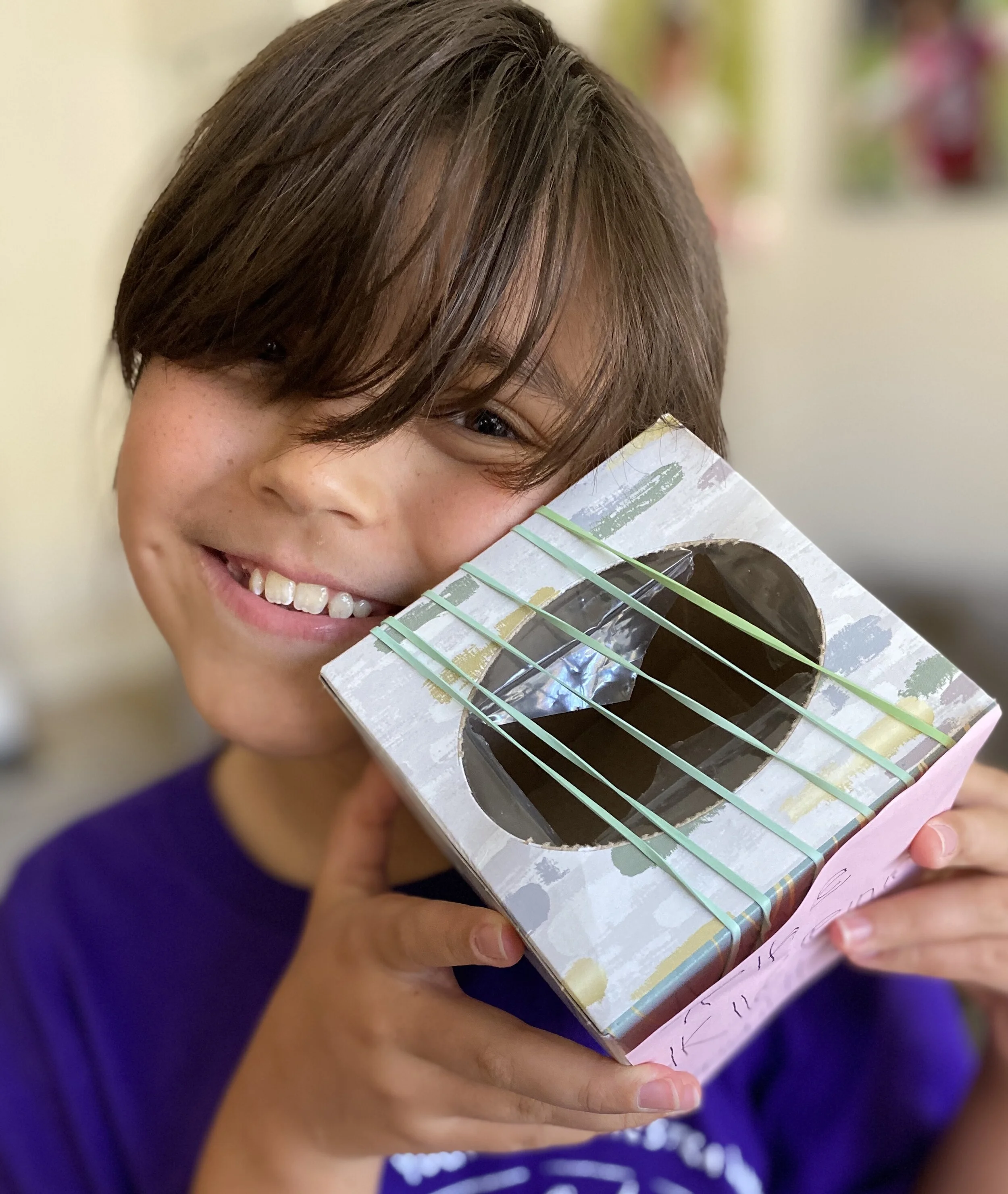 No drums? No problem! One of our most popular classes has been Home Percussion, which has given students the opportunity to learn the basics of percussion through instruments they find around their homes, or even by making percussion instruments out of unexpected objects. One student was so excited about the class that he even customized his home-built drum kit with his name!