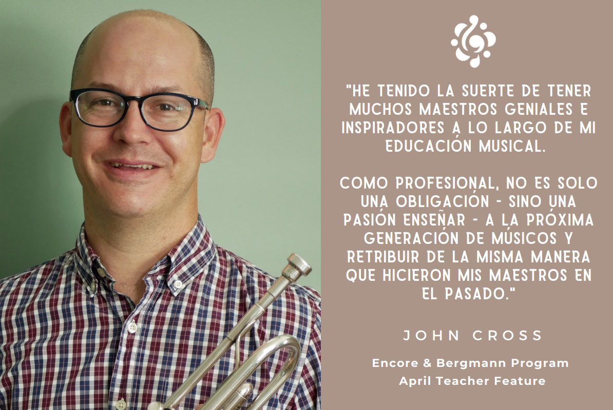 Este mes, presentamos a John Cross, quien es un maestro querido y dedicado, y que enseña para nuestras lecciones de Encore, así como para las lecciones del Programa Bergmann. ¡Nos encantó hablar con John sobre sus recuerdos musicales favoritos, sus consejos para los jóvenes músicos y el momento sorprendente que tuvo durante un concierto, que terminó convirtiéndose en uno de sus momentos de mayor orgullo como maestro! ¡Lea nuestra entrevista a continuación!