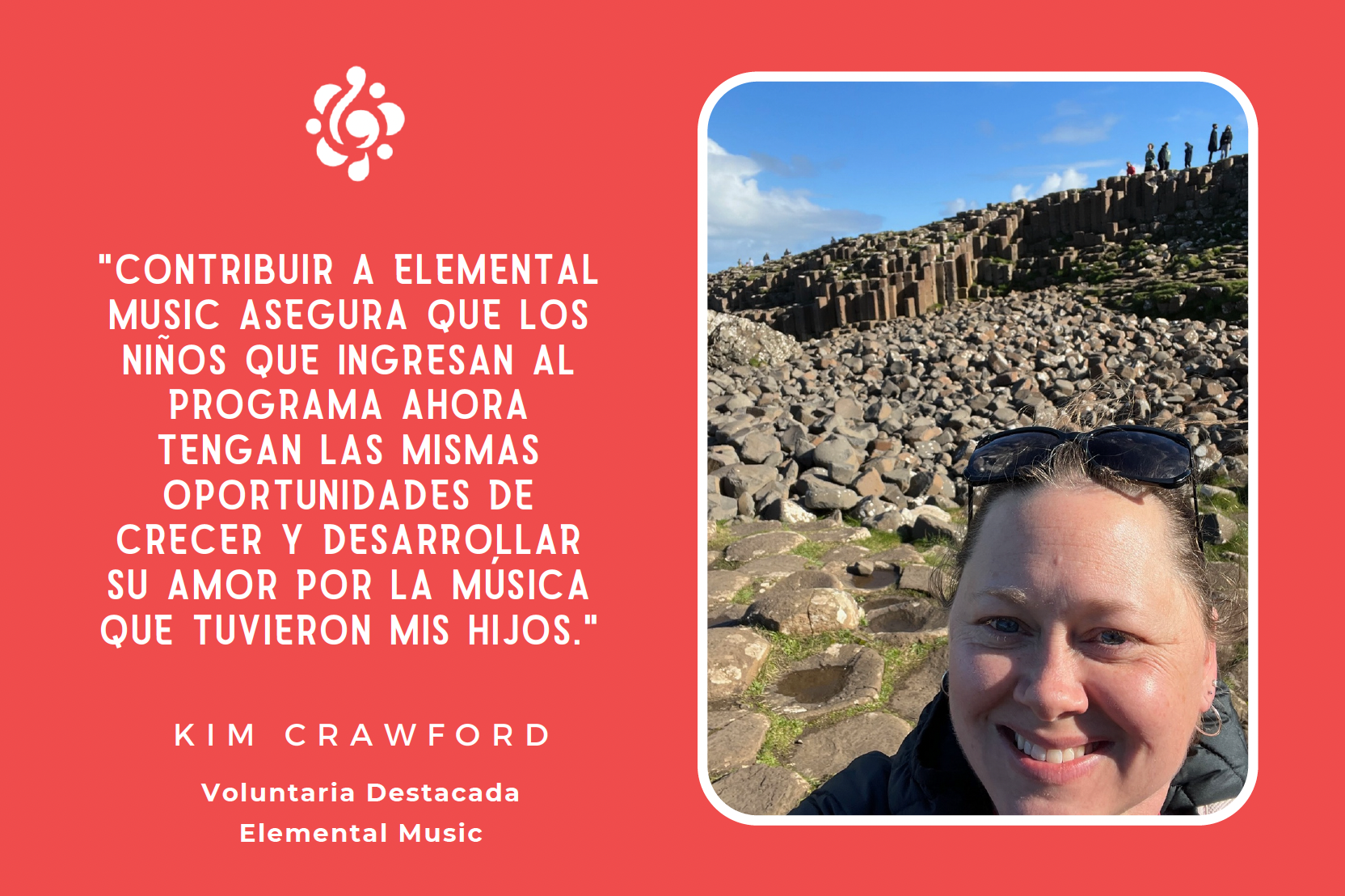 Kim Crawford: Comencé a ofrecerme como voluntaria para Elemental Music en 2018, cuando se estableció el Parent Task Force (el Grupo Operativo de Padres). En ese momento, ya tenía 3 hijos involucrados en Elemental Music (y otro pronto comenzaría), por lo que sabía la importancia y la calidad de los programas.