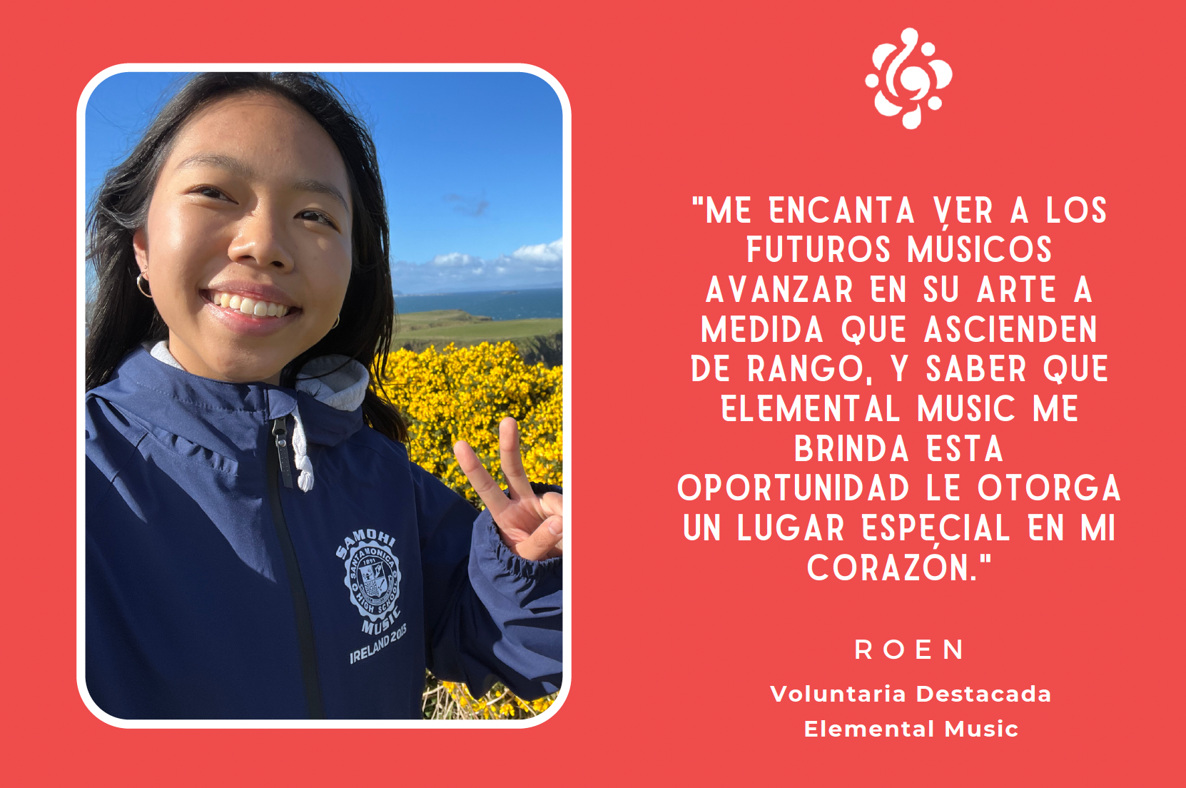 Roen: Le diría: si hubiera algún lugar para ser voluntario que fuera flexible cuando tienes un horario ocupado, sería Elemental Music. El voluntariado consiste en inscribirse en fechas que funcionen para el voluntario, y como tengo un horario en constante cambio, el tiempo y los recursos nunca han sido un problema. El programa de voluntariado es extremadamente acogedor y no me gustaría ser voluntaria en ningún otro lugar.