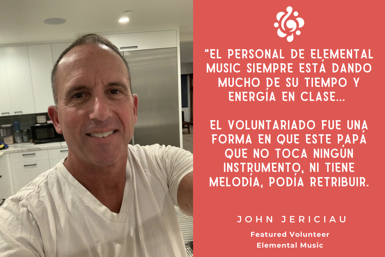 Hoy, presentamos a uno de los padres de Elemental Music, John Jericiau. John fue instrumental (sí, ¡juego de palabras!) para que nuestra subasta Bidding for Good de 2022 despegara, dedicando horas y horas de tiempo y esfuerzo para que el evento estuviera listo para comenzar. Con la ayuda de John, pudimos recaudar casi $10,000 en la subasta para apoyar nuestros programas de educación musical. ¡Caray! Estamos muy agradecidos. ¡A continuación, lea más sobre la historia de voluntariado de John!